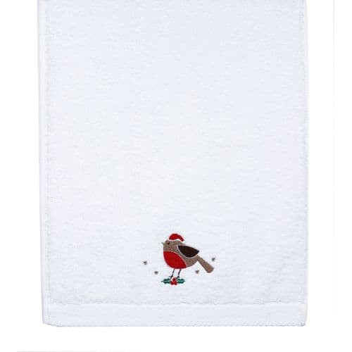Festive Robin Embroidered Hand Towel. Bring some festive charm to your cloakroom/bathroom with this delightful soft guest towel featuring a jolly Festive Robin in embroidery.