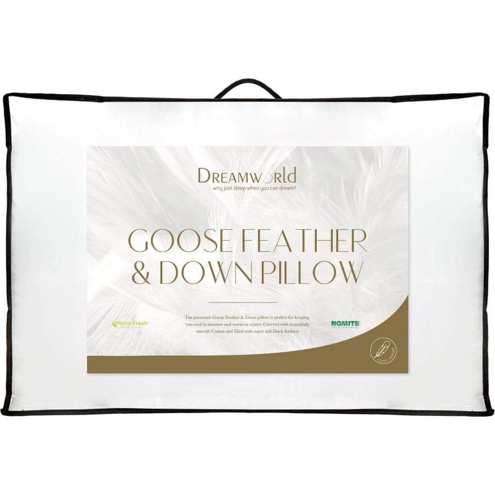 Experience unparalleled comfort with the Dreamworld Goose Feather and Down Pillow. Crafted with a 100% cotton outer case, it ensures a soft, breathable surface that enhances your sleep environment. Inside, natural filling with excellent thermal properties keeps you cosy and comfortable throughout the night. This pillow offers the perfect balance of support and luxury, inviting you to wake up refreshed and rested every morning. Elevate your bedtime with a pillow designed for restful, temperature-regulated sleep.
