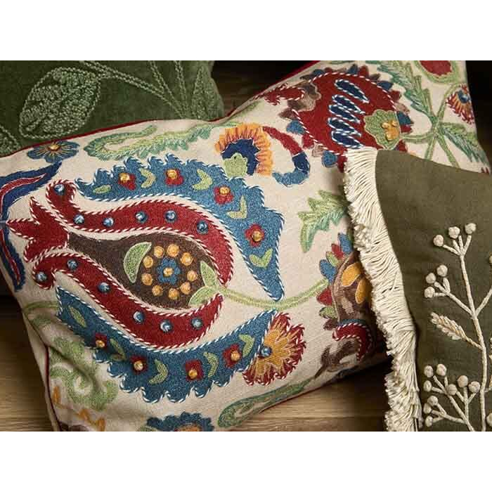 Heritage Cushion – A rectangular cushion featuring an embroidered suzani design. Zip closure for easy removal of the pad.