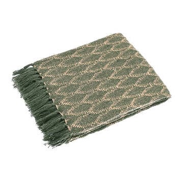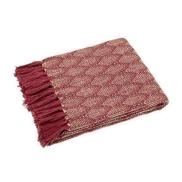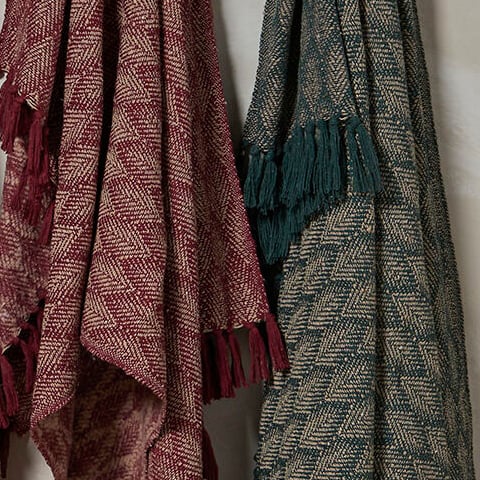 The Recycled Cotton Leaf Throw is a lightly brushed patterned throw with a softer feel, it is woven from recycled cotton in a mulberry or elm green colourway and features a tasselled fringe.