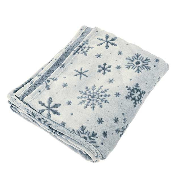 Sheared fleece blanket in off white featuring blue snowflakes. The Snowflake Throw is rolled and tied with a wide grosgrain ribbon, perfect for Christmas gifting.