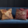 A beautifully adorned Teatro Cushion – In Plum colour tones is foil printed and hand-finished with intricate beading work.